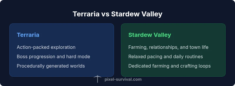 Terraria emphasizes action-packed exploration and boss-driven progression in a procedurally generated world, while Stardew Valley centers on farming, relationships, and town life in a cozy pixel-art setting. This quick comparison highlights core mechanics, pacing, and player goals to help you pick the title that matches your preferred playstyle and cadence.