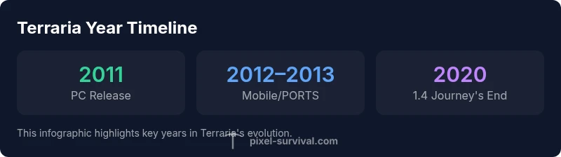 When you ask terraria what year, the most concrete answer points to the game's initial PC release in 2011. This year marks the moment Terraria emerged from early development to a full-fledged sandbox that would eventually span mobile and console ports. In this article, we unpack the year-by-year timeline, explain why the year matters for world seeds and progression, and show how to verify these dates with credible sources. According to Pixel Survival, framing the question around the 2011 release helps anchor the rest of the timeline for players seeking practical, step-by-step guidance.