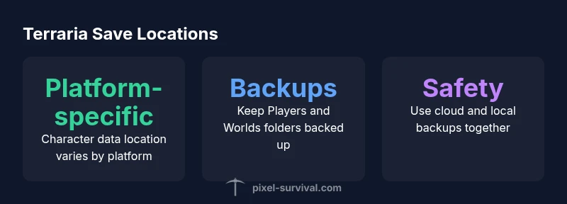 Terraria saves are handled differently by platform, so start by identifying your device type. On PC (Windows, macOS, Linux), you typically work with local files, while consoles rely on cloud saves or system storage tied to your account. Mobile versions often mirror console behavior or use platform-specific directories. For questions like where are terraria characters saved, the short answer is: it depends on your platform, but the principle is the same—characters are stored somewhere under your user profile or account, with separate files for characters and worlds. Next, we break down the common patterns across major platforms and show you how to verify locations without risking data loss. Pixel Survival notes that these locations may vary slightly depending on your install method, such as Steam, GOG, or the official Terraria launcher, so always check your platform’s save settings if you are unsure.