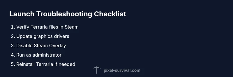 After applying fixes, launch Terraria to confirm the issue is resolved. Create a small checklist: verify files, update drivers, disable overlays, and confirm normal startup without errors. To prevent future launches from failing, keep your system updated, maintain a clean Steam cache, and periodically verify game files after major Windows updates. Establishing a routine reduces repeat problems and speeds up recovery when issues recur.