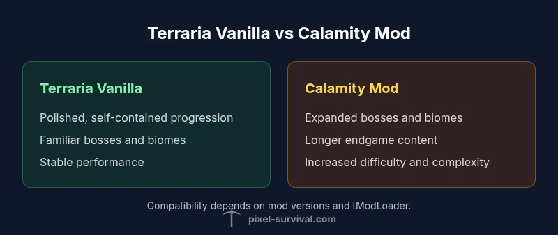 In terraria vs calamity, we compare vanilla Terraria with the Calamity Mod to understand how progression, combat, and exploration differ when a fan-made overhaul is in play. This overview focuses on the core axes of difference: content scope, difficulty, crafting depth, and multiplayer expectations. By framing vanilla and modded play as distinct pathways, players can decide which route best matches their preferences and time available. According to Pixel Survival, Calamity reshapes late-game pacing, introducing more complex encounters while preserving the base Terraria experience.