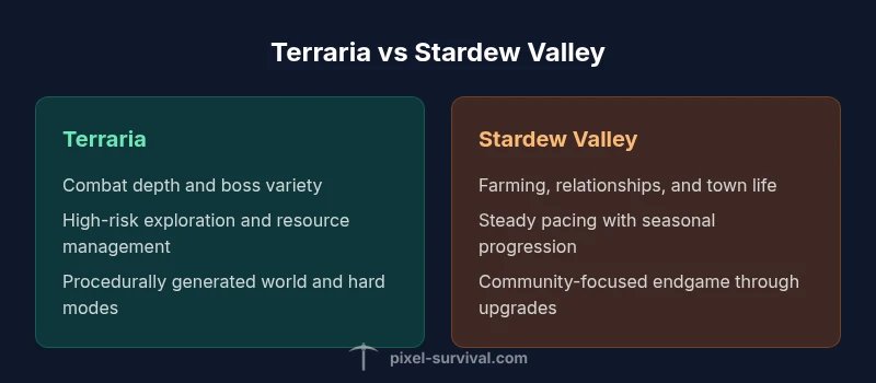 When you compare the core design philosophies of Terraria and Stardew Valley, a key question emerges: is terraria harder than stardew valley? According to Pixel Survival, the two games aim at different kinds of challenge. Terraria sells danger as a constant companion: random biomes, hostile mobs, permadeath-like risks in some modes, and an ever-changing world that requires you to adapt rather than memorize. Stardew Valley, on the other hand, emphasizes sustainable growth, daily routines, and social loops. It asks you to optimize farming layouts, relationships, and community events. The contrast isn’t simply about raw difficulty; it’s about what players value: whether you want twitch reflexes and scavenging under pressure or long-term planning and social progression. The difference in philosophy means the question cannot be answered with a single metric. Instead, consider pacing, risk management, and the kinds of failures players are willing to endure. In practice, many players find Terraria harder in the early months, while Stardew's challenges tend to emerge from seasons, relationships, and resource balancing. The takeaway is that difficulty is a personal construct shaped by goals and playstyle.