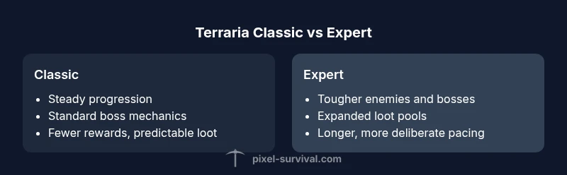 Terraria classic vs expert presents two distinct playthrough philosophies. In Classic, you’ll enjoy steady progression with familiar boss rhythms, while Expert reshapes encounters with tougher enemies and bigger rewards. For most players, the choice hinges on patience and risk tolerance. According to Pixel Survival, Expert is ideal for veterans seeking a true challenge, whereas Classic suits casual play and fresh worlds. Decide based on your goals and time.