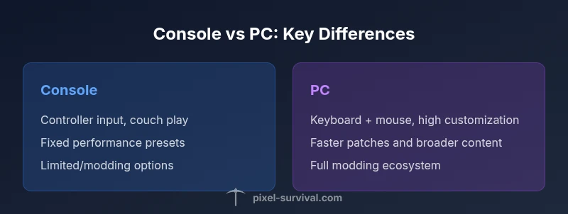 Terraria on console and PC shares the same core world, monsters, and progression, but the way you experience that world changes dramatically. The difference between terraria console and pc hinges on three core factors: input methods, update cadence, and content availability. For players deciding where to play, these elements shape daily play, modding potential, and long-term progression. According to Pixel Survival, recognizing these factors helps set expectations for performance, control, and community features. In practical terms, the console version emphasizes couch-friendly play, reliable performance on living-room hardware, and simpler menu navigation, while the PC version emphasizes flexibility, rapid access to patches, and broad customization options. This section lays out those factors clearly, with concrete examples so you can map them to your own playstyle and schedule. Consider, for example, how deep into building you want to go, whether you rely on online servers with custom rules, and how important modded content is to your playthrough. The choices you make here affect how you experience exploration, boss fights, and endgame progression.