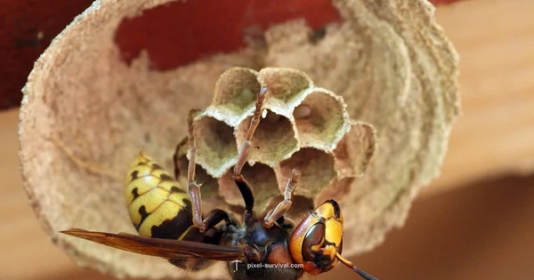 Find a hornet hive from a distance and study how hornets funnel toward light and edges. Wait for a lull in swarm density to plan your approach. Mark exit paths for retreat.