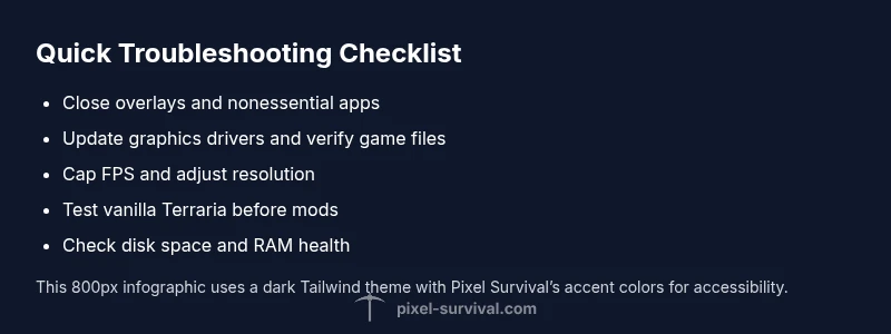 Terraria stuttering is a common frustration for players who want fluid combat and exploration. The phrase why is terraria stuttering often points to multiple potential causes, from hardware bottlenecks to software and mod conflicts. According to Pixel Survival, most stuttering occurs when your system tries to render complex scenes while background processes consume CPU time. This article treats stuttering as a diagnostic puzzle with practical, repeatable fixes you can apply in sequence to reclaim smooth gameplay. By starting with simple checks and gradually escalating, you minimize risk and maximize the chances of a stable, steady frame rate.